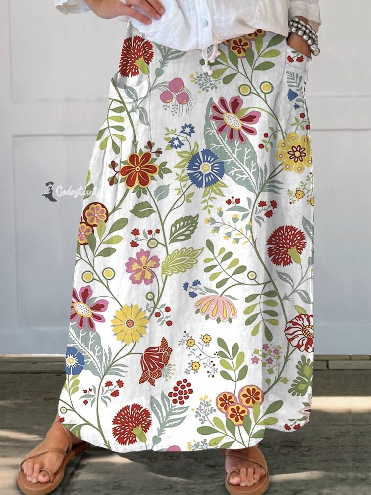 Women'S Retro Floral Art Print Casual Linen Pocket Skirt