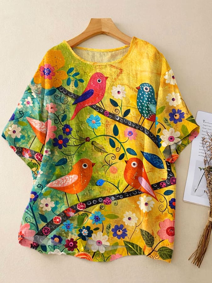 Women'S Retro Flowers and Birds Art Print Casual Crew Neck Shirt