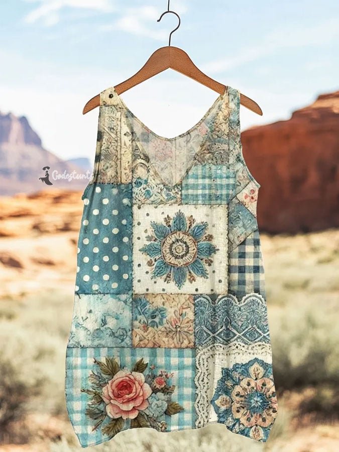 Women's Retro Loose Floral Patchwork Linen Suspender Sleeveless Tank Top
