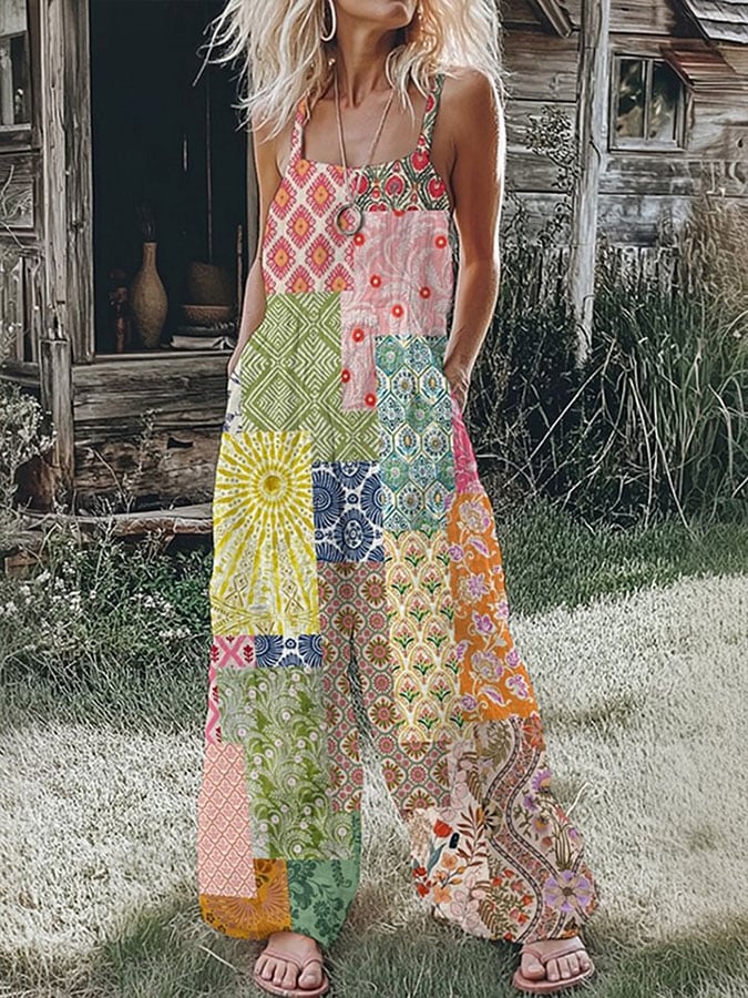 Women's Retro Pastoral Floral Stitching Printed Casual Loose Overalls