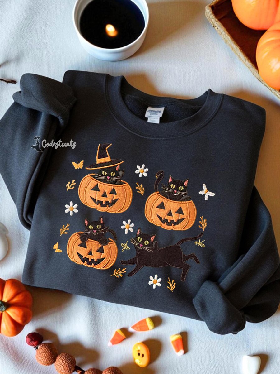 Women's Round Neck Halloween Black Cat Pumpkin Embroidery Loose Long Sleeve Top