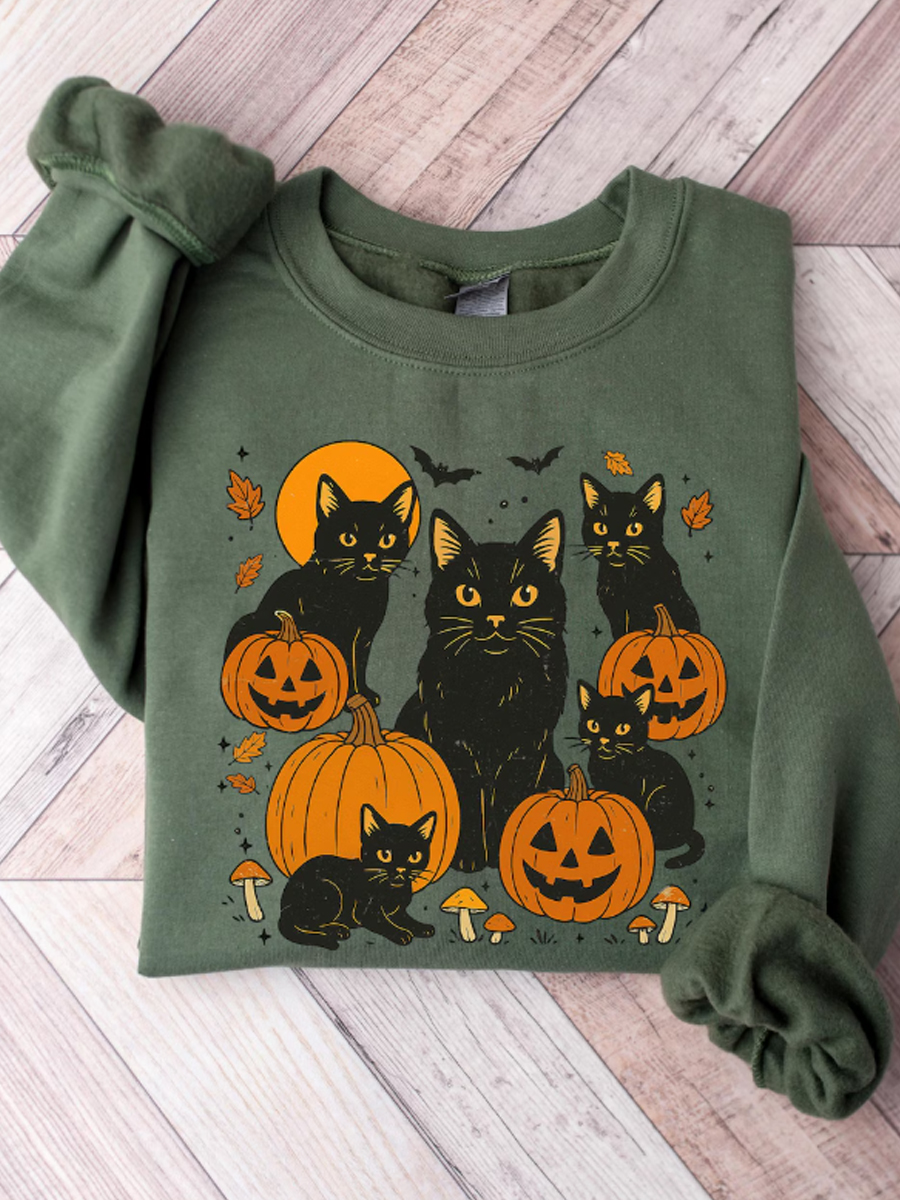 Women's Round Neck Halloween Black Cat Pumpkin Embroidery Loose Long Sleeve Top