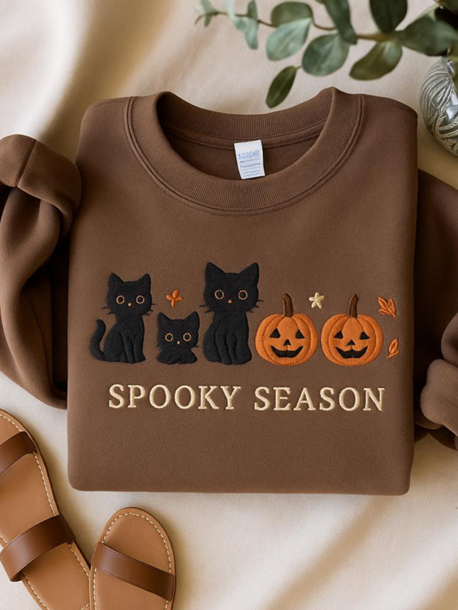 Women's Round Neck Halloween Black Cat Pumpkin Embroidery Loose Long Sleeve Top