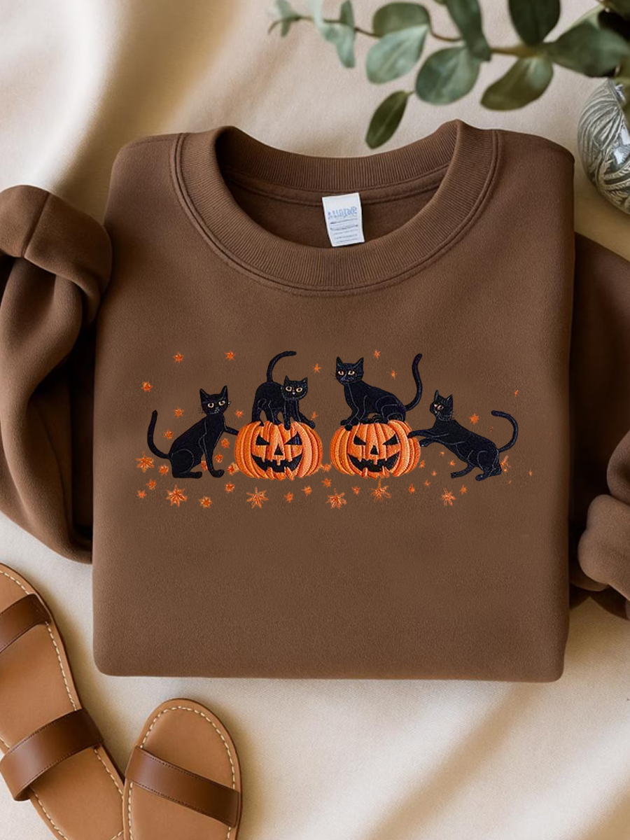 Women's Round Neck Halloween Black Cat Pumpkin Embroidery Loose Long Sleeve Top