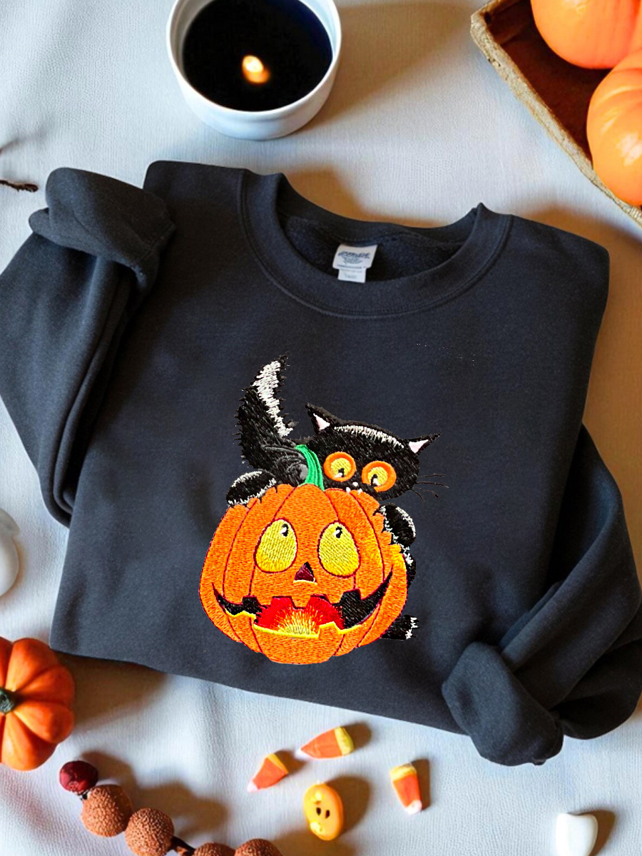 Women's Round Neck Halloween Black Cat Pumpkin Embroidery Loose Long Sleeve Top