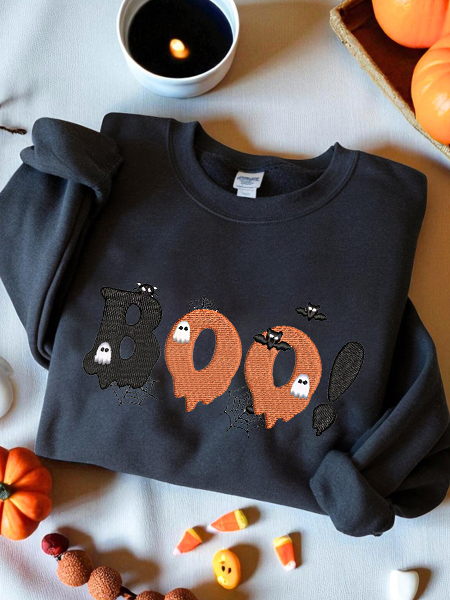 Women's Round Neck Halloween Black Cat Pumpkin Embroidery Loose Long Sleeve Top