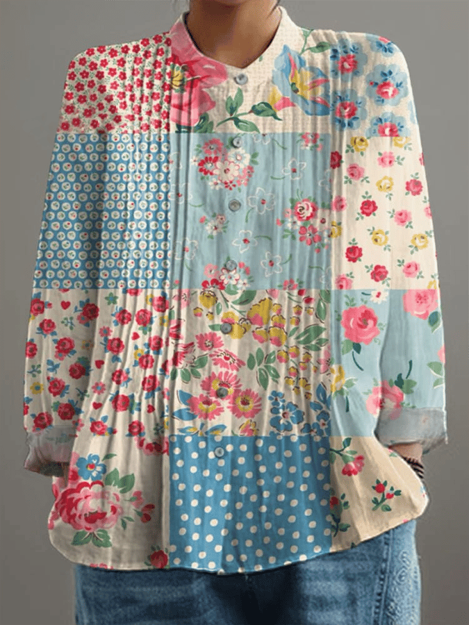 Women's Vintage Botanical Floral Patchwork Art Print Pleated Design Shirt