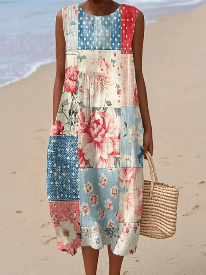 Women's Vintage Botanical Floral Patchwork Art Print With Pockets Dress