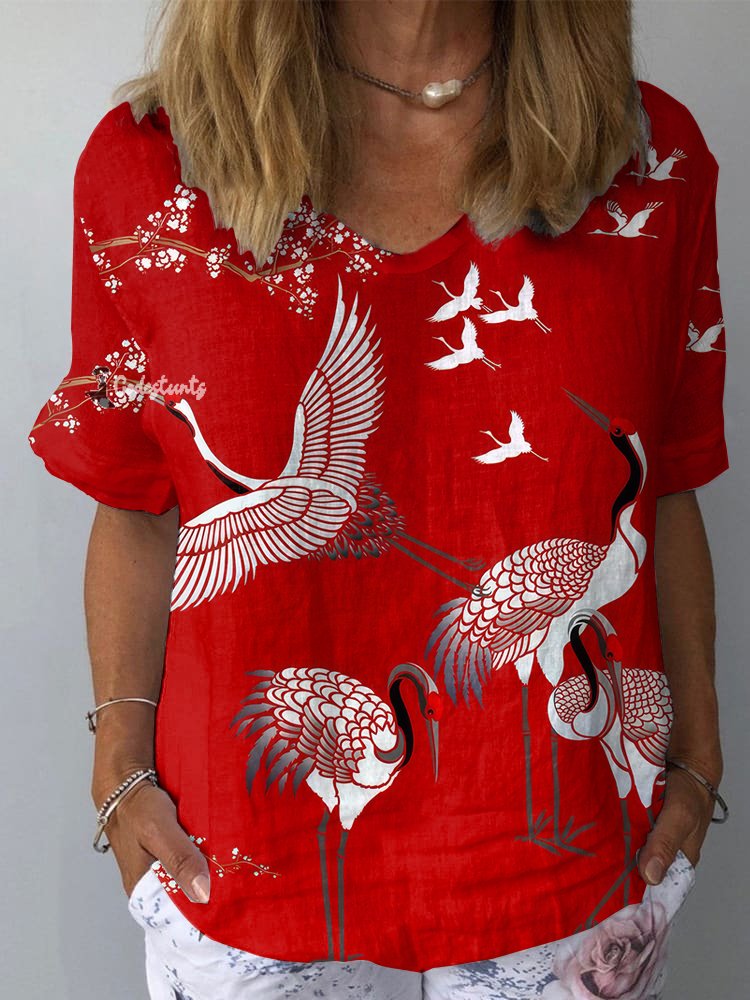 Women's Vintage Crane Art Print Casual V-Neck Cotton And Linen Top