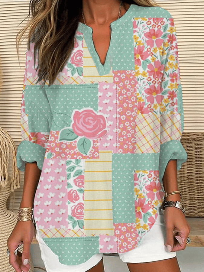 Women's Vintage Floral Print Casual Long Sleeve V-Neck Shirt