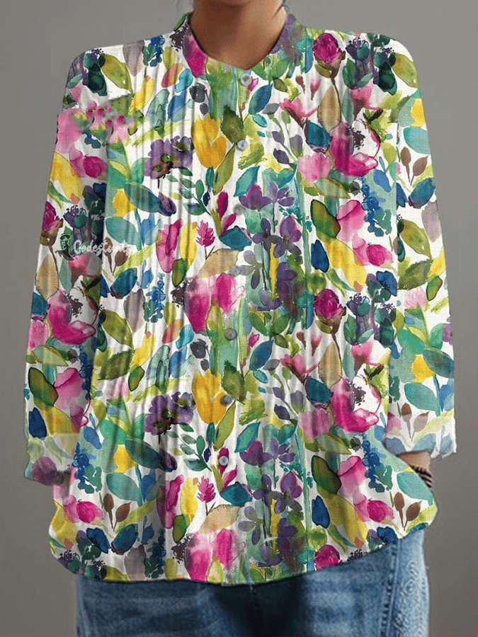 Women's Vintage Oil Painting Floral Art Print Pleated Design Shirt