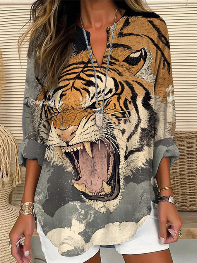 Women's Vintage Tiger Print Linen V-neck Shirt